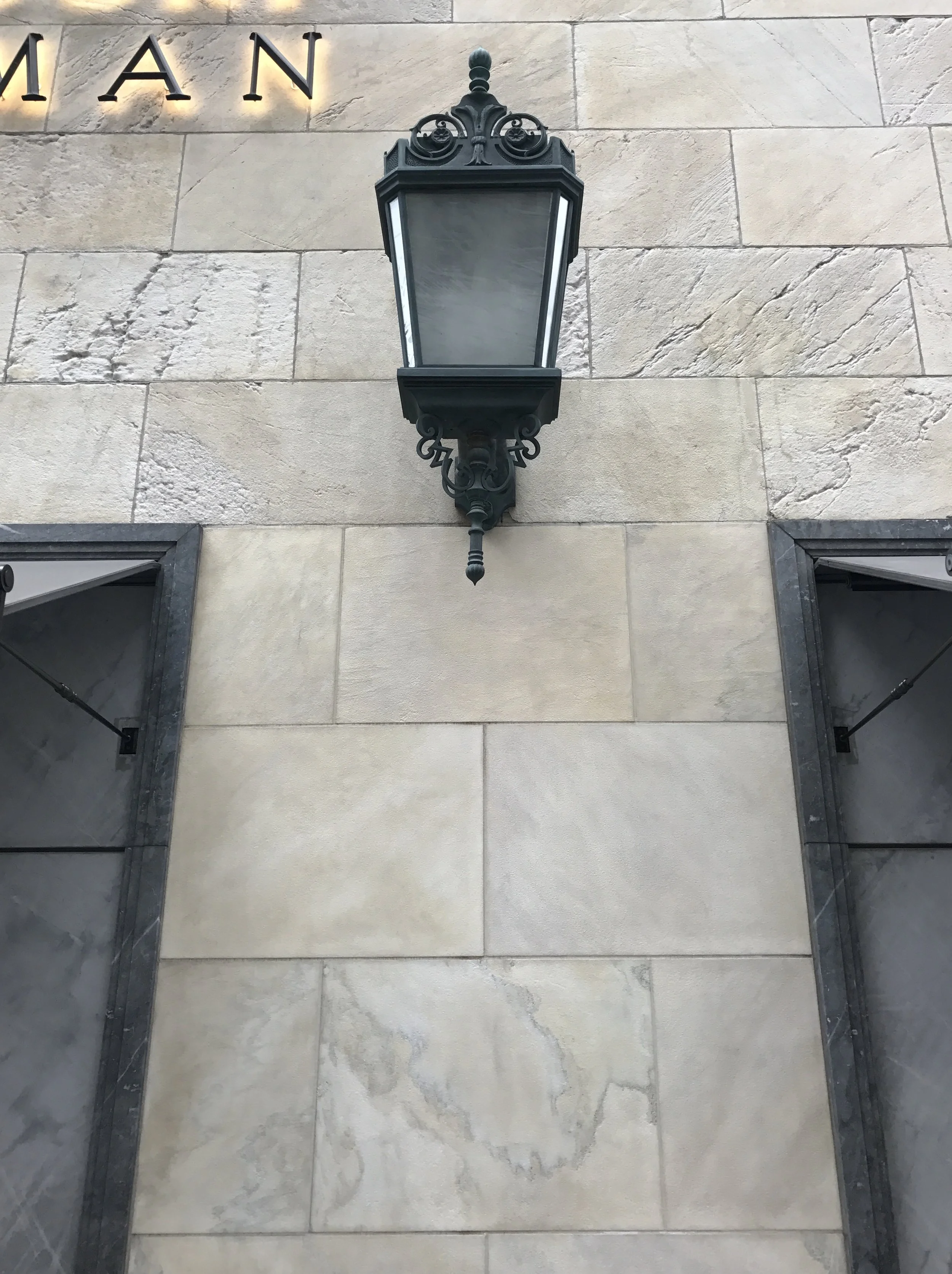 Detail of new marble installed around store windows. In addition, existing holes remained in the facade from removal of window display awnings, located to the right of the light fixture.