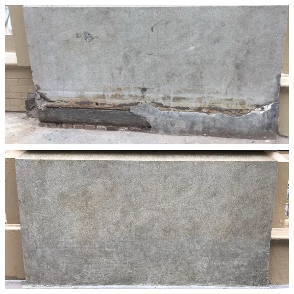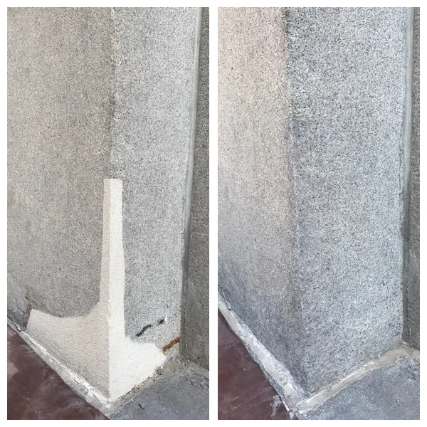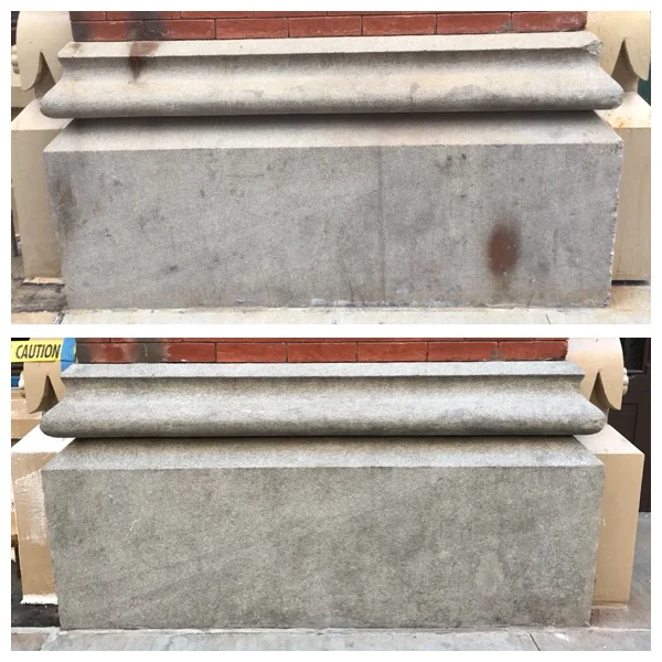 Completed granite facade restoration through cleaning, patching and color matching (bottom).